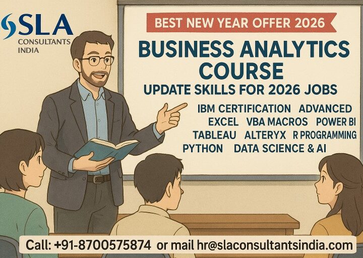 SLA Consultants in Delhi’s Laxmi Nagar (110090) ranks among the top 10 Business Analyst courses open for enrollment under the “New Year Offer 2026,” featuring free Python, free Tableau, and a Data Science course with IBM Certification support for 100% job guarantee. These elite programs span 90-125 hours across 10 modules like Advanced Excel/VBA, SQL/MS Access, Power BI/Tableau visualization, Alteryx ETL, R analytics, and AI/ML via live projects, targeting freshers for 5-8 LPA roles at Deloitte, Accenture, Genpact.